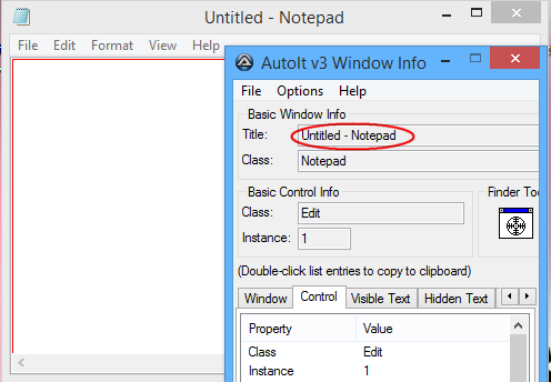 Note that the Window Info Tool has seen the title and text of the notepad window. Whatever the Window Info Tool can see is what AutoIt can see. Now we have enough information to identify this exact window even if there are lots of other notepad windows open. In this case we use: